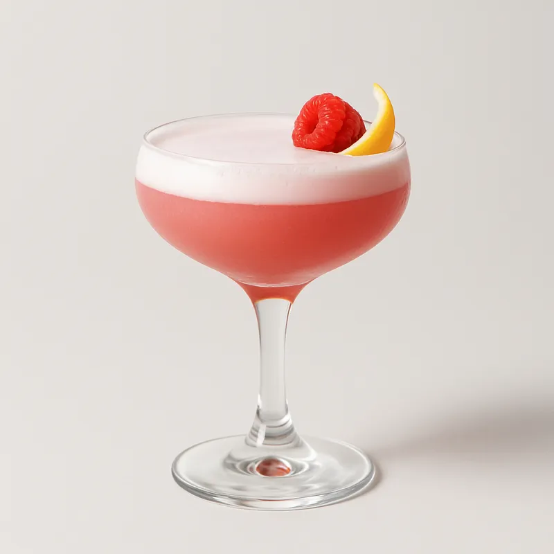 The Clover Club is a classic cocktail made with gin, lemon juice, simple syrup, and egg white, garnished with raspberries.