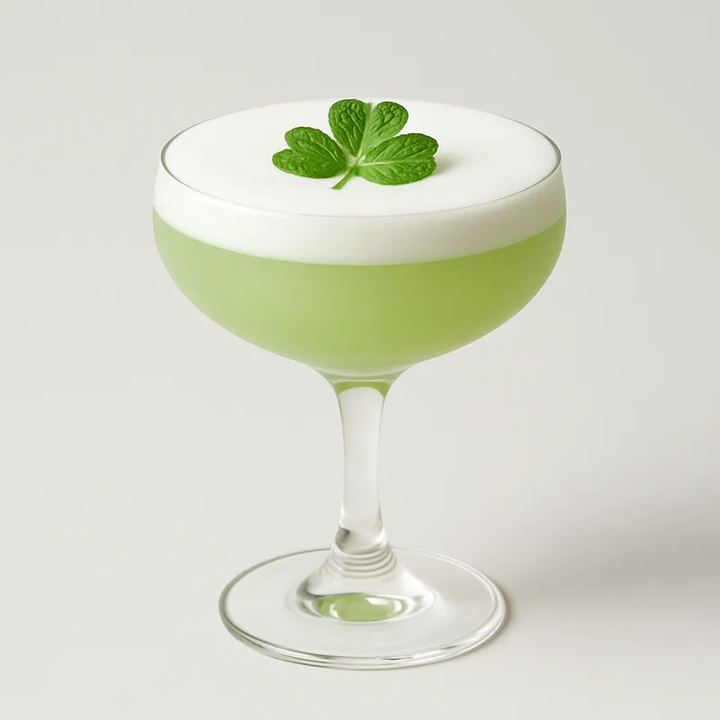 An Irish whiskey sour with a green tinge from fresh herbs or crème de menthe, perfect for St. Patrick's Day celebrations.