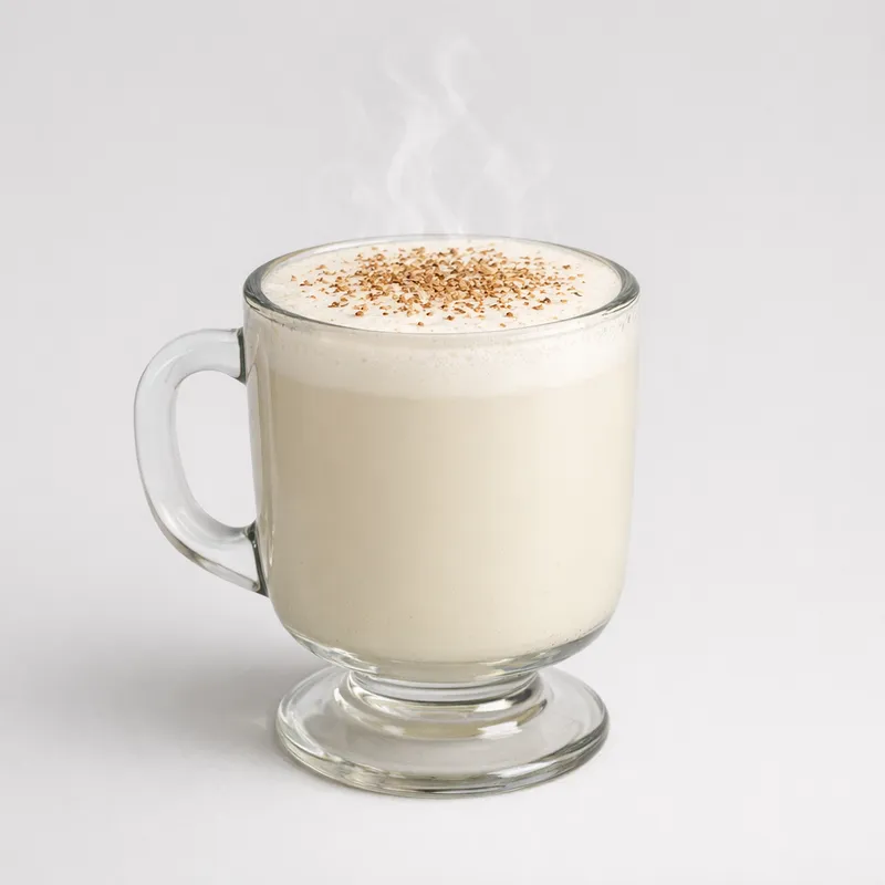 - 4Top with hot milk and grate fresh nutmeg on top.